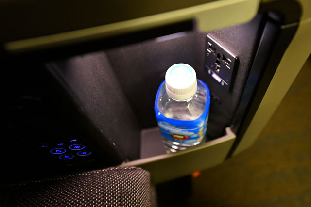 500mlのペットボトルを置いたANAの新プレミアムクラスの小物入れ=19年11月16日 PHOTO: Tadayuki YOSHIKAWA/Aviation Wire