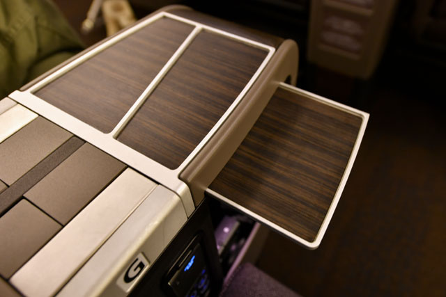 センターコンソールのカクテルトレーを出した状態でテーブルを出したANAの新プレミアムクラス=19年11月16日 PHOTO: Tadayuki YOSHIKAWA/Aviation Wire