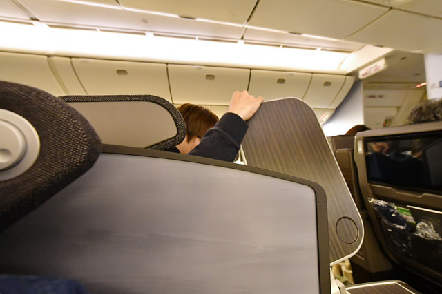 そして、売りのひとつである15.6インチモニターは角度が調節できるため、前席がリクライニングしても見やすい角度に変えられる。たまたま前席の乗客が羽田到着前にシートを倒したのでモニターの角度を調節してみたが、特に不満に感じることはなかった。そして、リクライニング部分がこちらへあまり迫ってこないので、圧迫感を感じることはなかった。東海道新幹線のグリーン車のように、前席のおじさんの頭頂部全開ということにはならない。