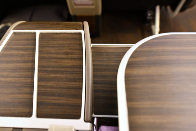 ANAの新プレミアムクラスのセンターコンソールとカクテルトレー=19年11月16日 PHOTO: Tadayuki YOSHIKAWA/Aviation Wire