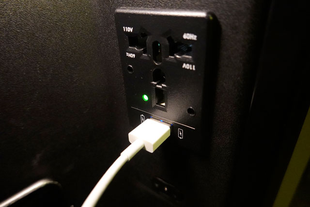 ANAの新プレミアムクラスの電源コンセント(上)と充電用USB端子=19年11月16日 PHOTO: Tadayuki YOSHIKAWA/Aviation Wire