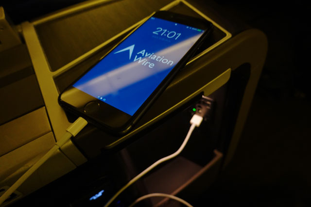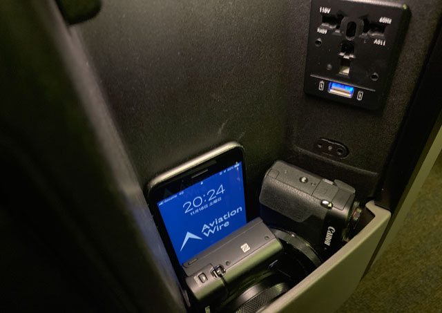 iPhone 8を充電用USB端子に接続したANAの新プレミアムクラス=19年11月16日 PHOTO: Tadayuki YOSHIKAWA/Aviation Wire