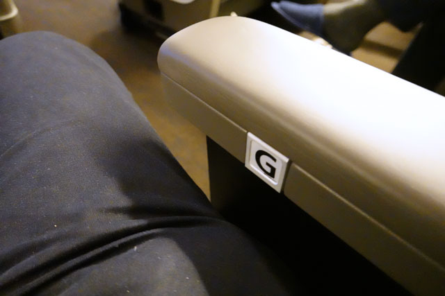 座席幅はクラス最大となる56センチで、3人掛け中央のみ52センチ。電動リクライニングのほか、座席横にペットボトルなどが収納できる小物入れを設け、電源コンセントと充電用USB端子を設置し、テーブルは90度回転する大型のものを採用した。座席間には固定式大型ディバイダー(間仕切り)を設置し、プライバシーを確保した。