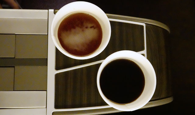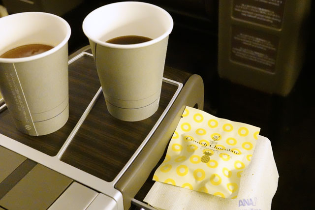 しかし、プレミアムクラスでは食事後にコーヒーなどがお茶菓子と一緒に出てくるので、飲み物をセンターコンソール、お菓子をトレーに置けば、テーブルをしまっても置き場に不自由することはなかった。