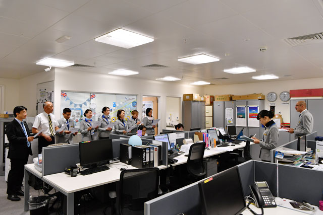 ヒースロー空港でブリーフィングするANAのスタッフ=PHOTO: Tadayuki YOSHIKAWA/Aviation Wire