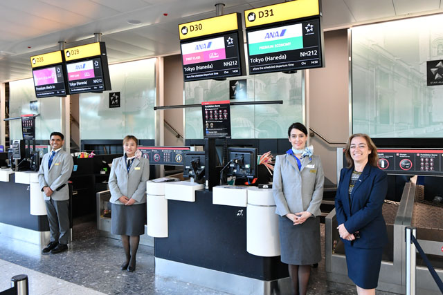 ヒースロー空港のカウンター前に並ぶANAの大野ロンドン支店空港所長(中央)と地上係員ら。ロンドン線の平均搭乗率は9割に達する=PHOTO: Tadayuki YOSHIKAWA/Aviation Wire