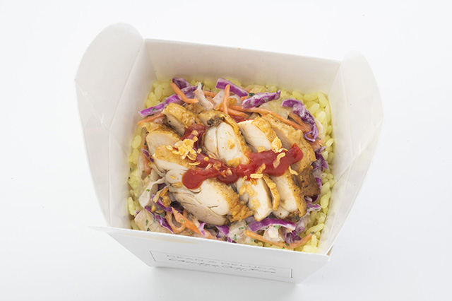 ターメリックバターライスの上にケイジャンチキンを乗せた「チキンオーバーライス」を提供する。ライスとスパイスの効いたチキンをコールスローと混ぜ、さまざまな食材と食感を楽しめるようにした。デザートには、コーヒーゼリーとミルクシロップも用意する。