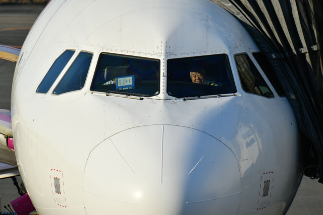 宮崎空港で最後の出発準備を進めるピーチの角城機長(右)=19年12月3日 PHOTO: Tadayuki YOSHIKAWA/Aviation Wire