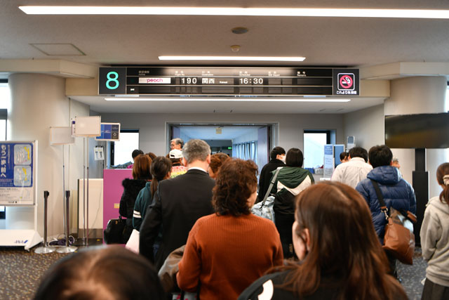 宮崎空港8番搭乗口で関西行きMM190便に搭乗する乗客=19年12月3日 PHOTO: Tadayuki YOSHIKAWA/Aviation Wire