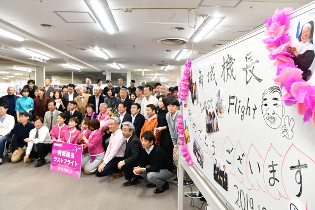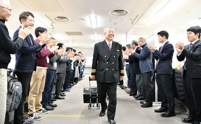 日本でただひとりの“空飛ぶ副社長”を務めるピーチ・アビエーション(APJ/MM)の角城健次機長が12月3日、68歳の誕生日を前にラストフライトを終えた。航空法により旅客機の機長としては定年を迎えるためで、関西空港のオフィスには多くの社員が集まり、48年間のパイロット人生を終えた角城機長を出迎えた。