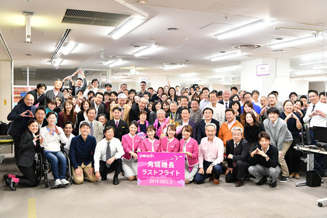 ラストフライトを終え関西空港のオフィスでピーチの社員と記念撮影する角城機長=19年12月3日 PHOTO: Tadayuki YOSHIKAWA/Aviation Wire