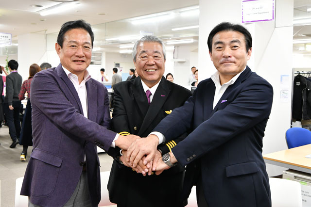 ラストフライトを終え関西空港のオフィスで井上CEO(左)と森副社長(右)と握手を交わす角城機長=19年12月3日 PHOTO: Tadayuki YOSHIKAWA/Aviation Wire