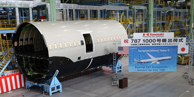 川崎重工業(7012)は、ボーイング787型機の1000号機用前部胴体を12月下旬にボーイングへ納入する。