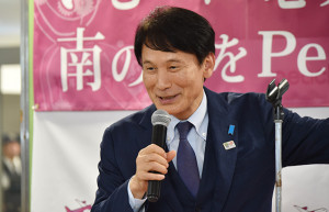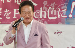 奄美空港の到着口前で開催したセレモニーで、三反園知事は「奄美群島の振興は、県政の重要な柱」と述べ、注力する考えを示した。「ピーチの就航をきっかけとし、地元自治体とともに群島の発展に寄与したい」と語り、今後はピーチへの支援を強化する姿勢を示した。