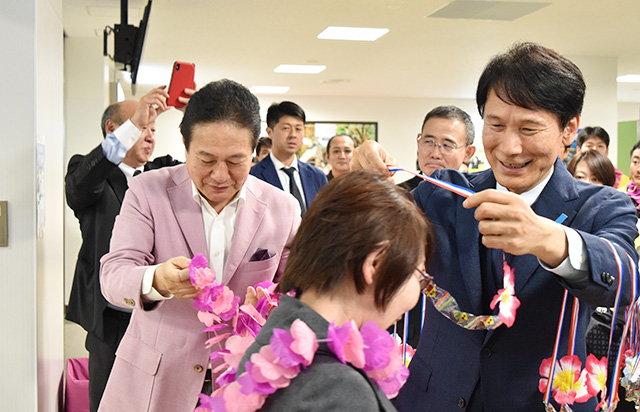 関空からの到着客にレイをかけて歓迎するピーチの井上CEO(左)と鹿児島県の三反園知事=19年12月26日 PHOTO: Yusuke KOHASE/Aviation Wire