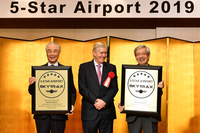 6年連続で5つ星を獲得した羽田空港のターミナルを運営する日本空港ビルの鷹城会長(左)とTIATの土井社長(右)と並ぶスカイトラックスのプレイステッド会長=20年1月22日 PHOTO: Tadayuki YOSHIKAWA/Aviation Wire