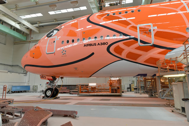 ハンブルクにある塗装工場(ペイントショップ)には、17日前に入場。16色の塗料と930種類のステンシル(型紙)を使い、1組24人の作業員が4交代で約120人が作業にあたったという。A380では通常150種類のステンシルで作業しており、デザインの複雑さがうかがわれた。
