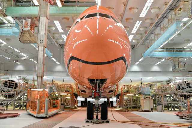 2本目 エアバス塗装工場でロールアウト待つANA A380 3号機 サンセットオレンジ JA383A
