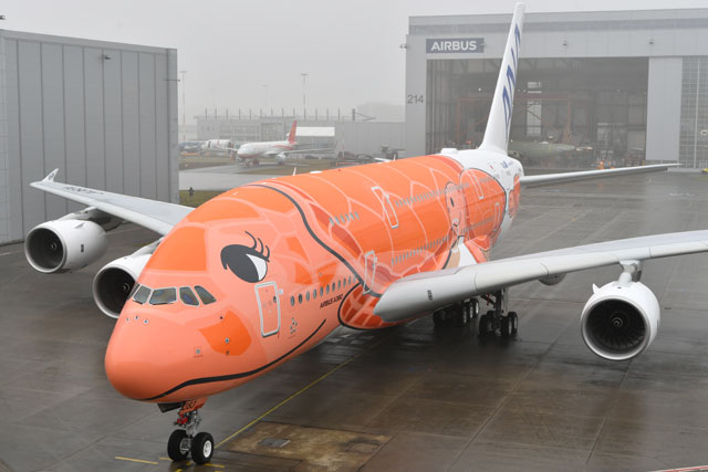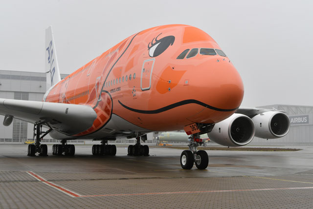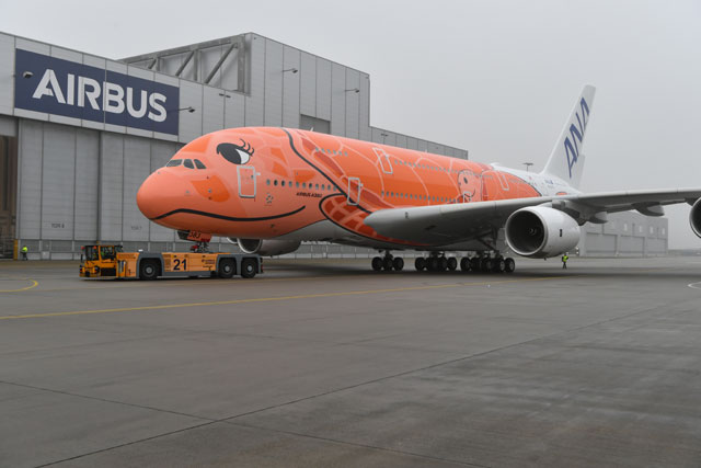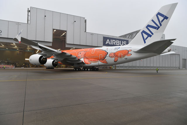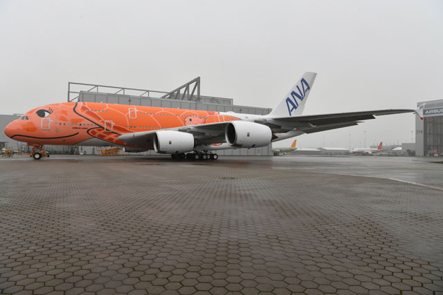 ANAを傘下に持つANAホールディングス(ANAHD、9202)は、2015年12月にA380を3機発注。「空飛ぶウミガメ」の意味を持つ「FLYING HONU(フライング・ホヌ)」と名付け、全機にハワイの空と海、夕陽をイメージした特別塗装を施した。初号機(JA381A)が青(ANAブルー)、2号機(JA382A)が深緑(エメラルドグリーン)、3号機がオレンジ(サンセットオレンジ)と、1機ごとにカラーリングが異なる。