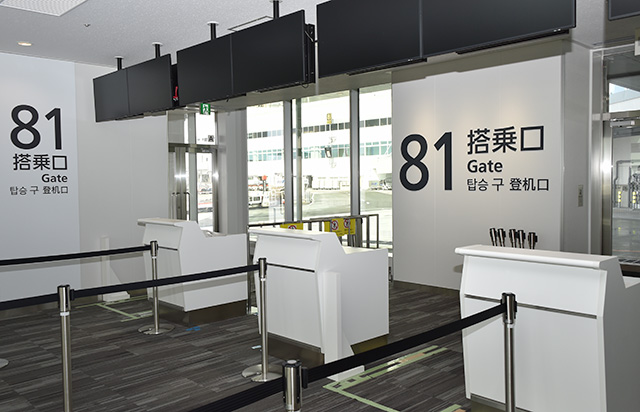 81・82番搭乗口の供用に伴い、北側にある現在の仮設バスラウンジ(41-45番搭乗口)は前日29日に閉鎖する。仮設バスラウンジは、2016年10月の旧国内線第1ターミナルビル閉館後から使用し、広さ460平方メートル、323席だった。