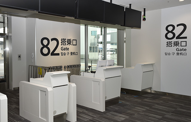 PBBを備える搭乗口は、整備前は13カ所。今回の9・10番搭乗口の供用開始により12カ所となるものの、このうち4カ所を大型機と小型機に対応できる「マルチスポット」としたため、最大で16機駐機できるようになる。