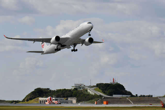 那覇空港を離陸し羽田へ向かう那覇発A350初便となったJL902便=20年2月1日 PHOTO: Tadayuki YOSHIKAWA/Aviation Wire