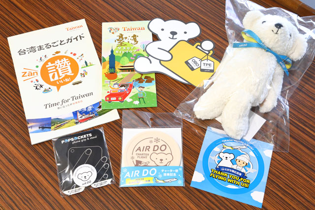 エア・ドゥの台北行きチャーターHD9251便で乗客に手渡した搭乗記念品=20年2月8日 PHOTO: Masahiro SATO/Aviation Wire