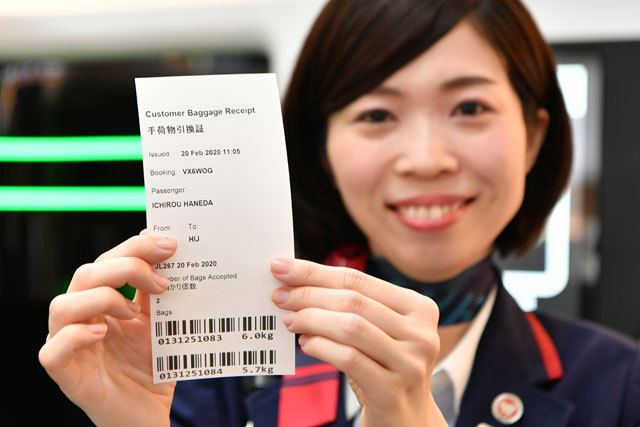 羽田空港で自動手荷物預け機が発行すする手荷物引換証を手にするJALの地上係員=20年2月20日 PHOTO: Tadayuki YOSHIKAWA/Aviation Wire