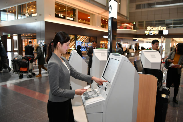 羽田空港の新型自動チェックイン機で搭乗手続きをするJALの女性社員=20年2月20日 PHOTO: Tadayuki YOSHIKAWA/Aviation Wire