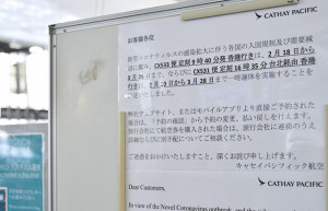 期間運休を伝えるキャセイパシフィック航空の中部空港カウンター=20年2月17日 PHOTO: Yusuke KOHASE/Aviation Wire