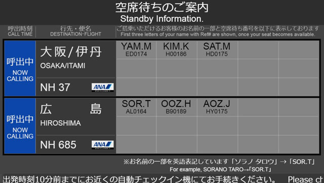 呼び出し方法も改め、空席待ちカウンターや搭乗口付近に設置するデジタルサイネージ(電子看板)に、空席待ちを申し込んだ人の名前の一部と空席待ち番号を表示。座席を確保できた場合、乗客が自分で搭乗口付近の自動チェックイン機を使い、搭乗手続きができる。従来は整理券の種別と番号を地上係員がアナウンスし、係員が一人ずつ手続きしていた。