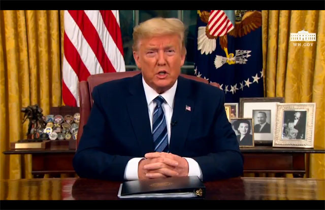 英国を除く欧州からの入国を30日間停止すると発表する米国のトランプ大統領(ホワイトハウスの動画から)