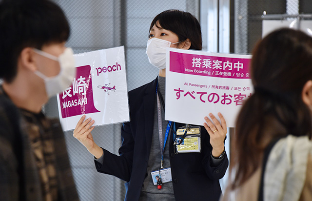 長崎行き初便の搭乗案内をするピーチの関係者=20年3月29日 PHOTO: Yusuke KOHASE/Aviation Wire