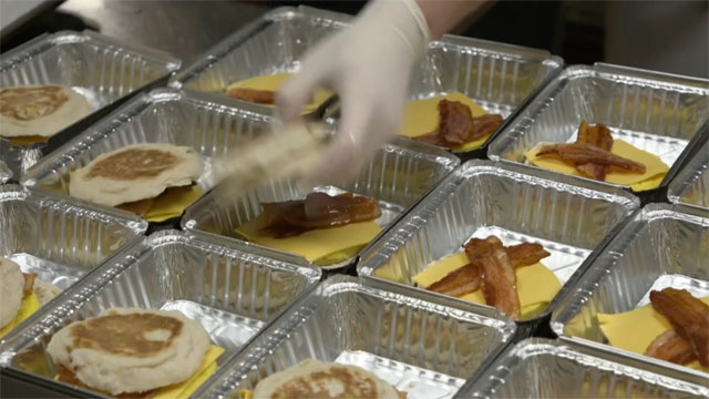 アメリカン航空が用意した機内食を持ち帰り用の食事として提供するスタッフ(同社の動画から)