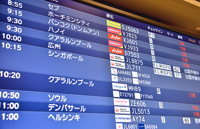 JALの広州行きチャーターJL8875便を表示する成田空港の出発案内=20年7月10日 PHOTO: Yusuke KOHASE/Aviation Wire