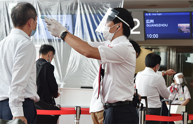 広州行きチャーター便の利用客を検温するJALの地上係員=20年7月10日 PHOTO: Yusuke KOHASE/Aviation Wire