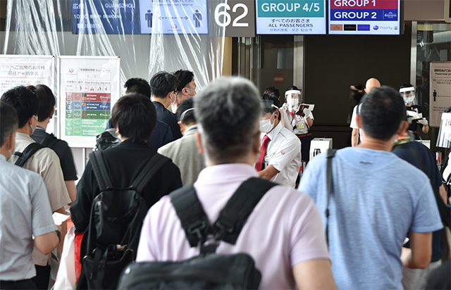 JALの成田発広州行きチャーター便に搭乗する利用客=20年7月10日 PHOTO: Yusuke KOHASE/Aviation Wire