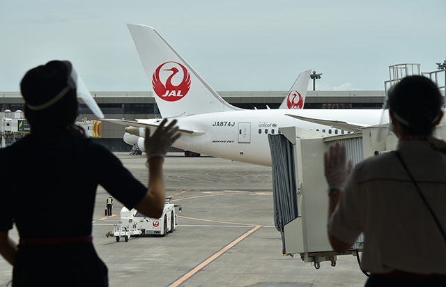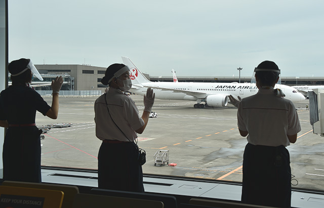 成田を出発する広州行きチャーターJL8875便を間隔を空けて見送るJALの地上係員=20年7月10日 PHOTO: Yusuke KOHASE/Aviation Wire