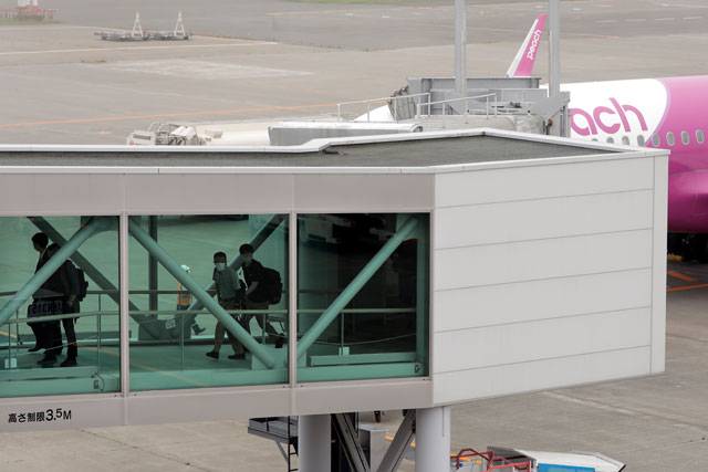 釧路空港に到着したピーチの成田発初便MM591便から降りる乗客=20年8月1日 PHOTO: Kiyoshi OTA/Aviation Wire