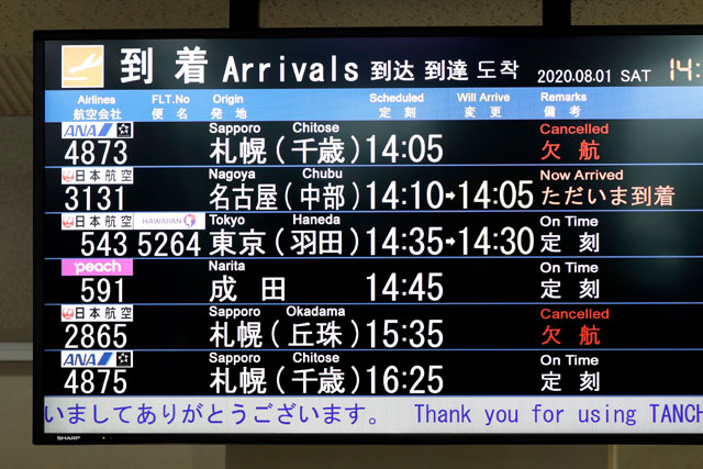 ピーチの成田発初便MM591便の到着を示す釧路空港の到着案内=20年8月1日 PHOTO: Kiyoshi OTA/Aviation Wire