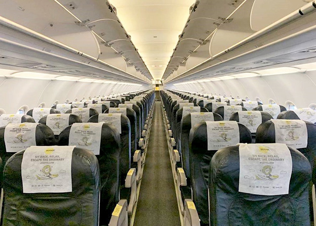 座席を備える改修前のスクートのA320機内(同社提供)
