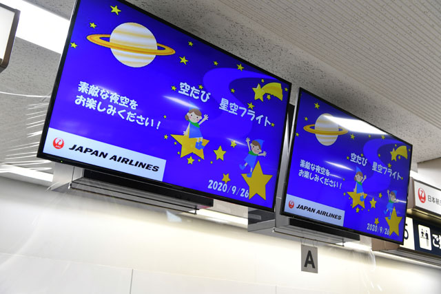 成田空港のチェックインカウンターに表示された星空フライトの案内=20年9月26日 PHOTO: Tadayuki YOSHIKAWA/Aviation Wire