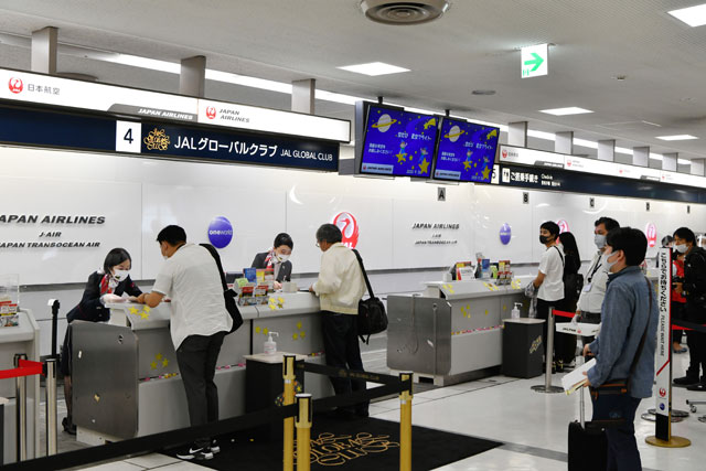 成田空港のチェックインカウンターで搭乗手続きするJALの星空フライトの参加者=20年9月26日 PHOTO: Tadayuki YOSHIKAWA/Aviation Wire