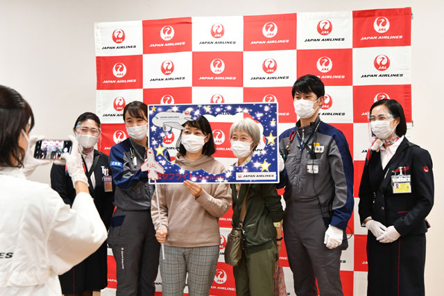 成田空港で星空フライトの参加者と記念撮影するJALの客室乗務員=20年9月26日 PHOTO: Tadayuki YOSHIKAWA/Aviation Wire
