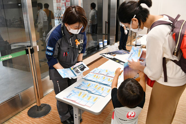 成田空港で星空フライトの参加者に手作りフォトフレームを手渡す整備士=20年9月26日 PHOTO: Tadayuki YOSHIKAWA/Aviation Wire