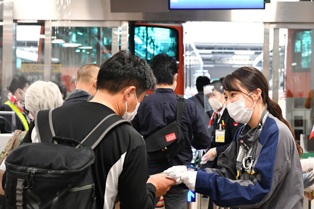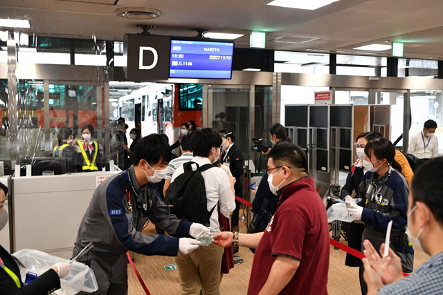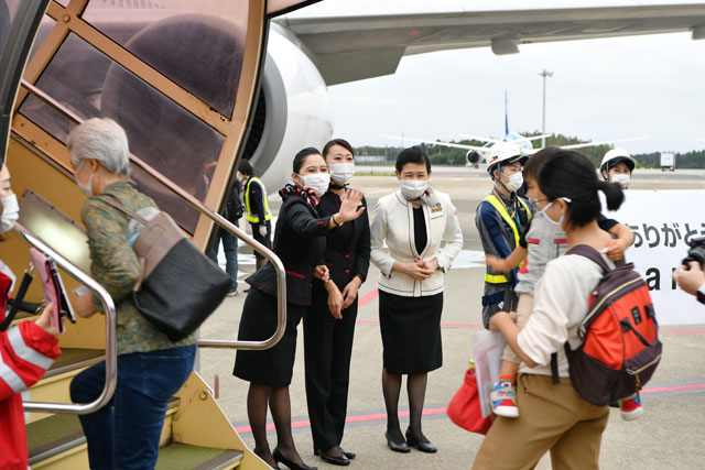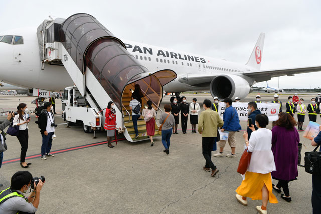 成田空港で星空フライトの参加者を出迎えるJALの客室乗務員=20年9月26日 PHOTO: Tadayuki YOSHIKAWA/Aviation Wire