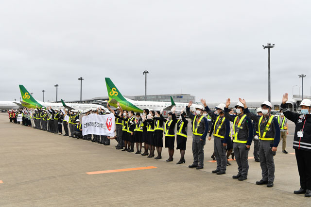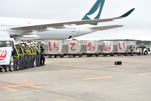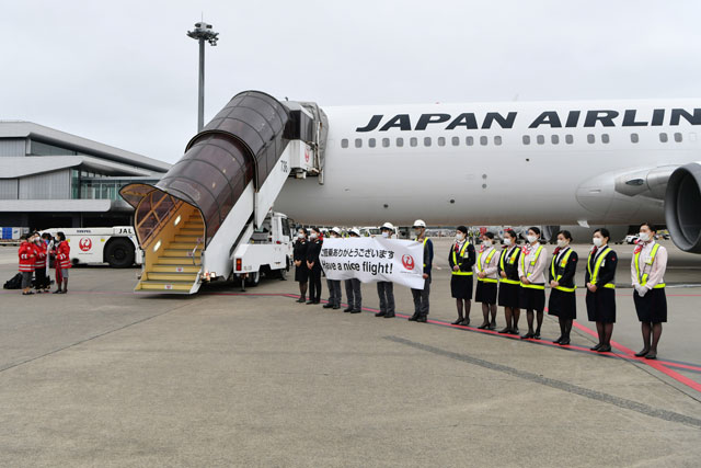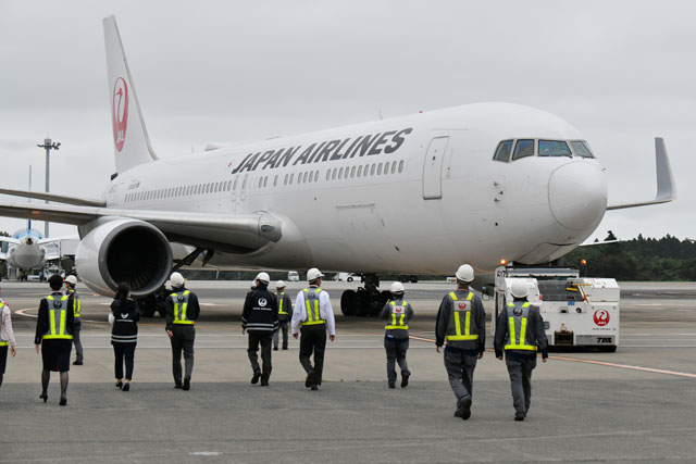 成田空港で星空フライトの参加者を出迎えるJALの客室乗務員や整備士、地上係員ら=20年9月26日 PHOTO: Tadayuki YOSHIKAWA/Aviation Wire