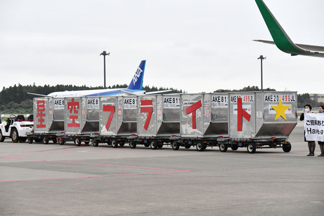 成田空港で星空フライトの見送り用に「いってらっしゃい」と装飾された貨物コンテナ=20年9月26日 PHOTO: Tadayuki YOSHIKAWA/Aviation Wire