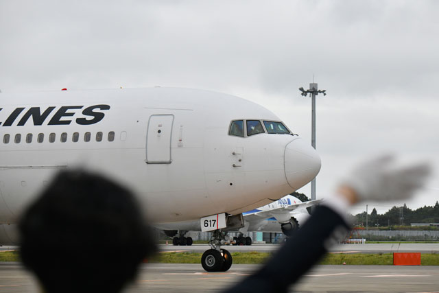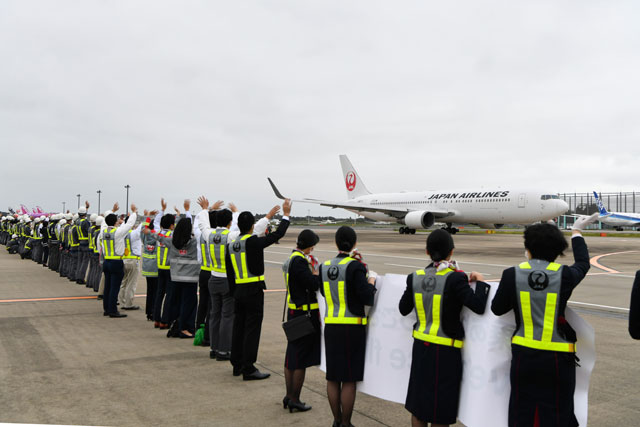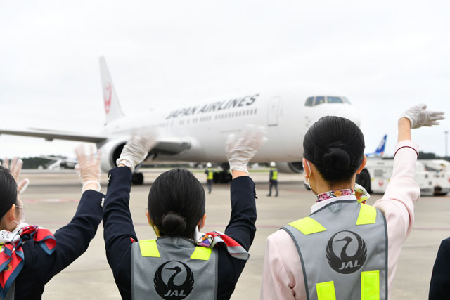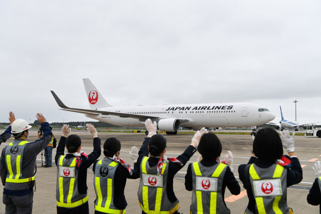 成田空港を出発する星空フライトのJL1146便を見送るJAL社員ら=20年9月26日 PHOTO: Tadayuki YOSHIKAWA/Aviation Wire
