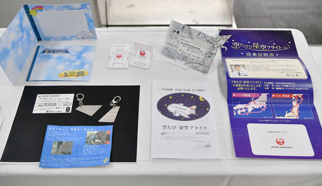 星空フライトの参加者に手渡されたキーホルダーや搭乗証明書などの記念品=20年9月26日 PHOTO: Tadayuki YOSHIKAWA/Aviation Wire